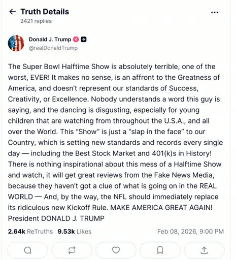 La presentación también generó repercusiones políticas. El presidente Donald Trump criticó duramente el espectáculo en su red Truth Social, calificándolo como “absolutamente terrible” y “uno de los peores de la historia”, además de describirlo como una “bofetada a nuestro país”. El exmandatario afirmó que el show no representaba los estándares estadounidenses y sostuvo que “nadie entiende una palabra” de la actuación, cuestionando incluso su contenido para audiencias familiares.