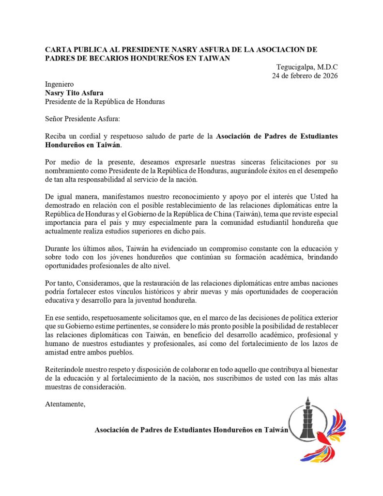 La Asociación de Padres de Becarios Hondureños en Taiwán, mediante carta pública, exhorta al Presidente Nasry Asfura a retomar las relaciones diplomáticas con la República de China (Taiwán), tal como lo prometió durante su campaña política. A continuación, publicamos la carta íntegra: